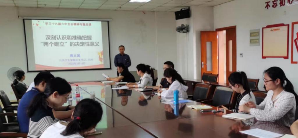 学校党委常委、副校长胡丙杰分别以“总结党的百年奋斗重大成就和历史经验”和“牢记初心使命,坚决拥护两个确立——学习十九届六中全会精神” 为主题,为教工第一支部党员作了两次专题党课。性吧 总支书记、院长蒋义国为该支部党员分别就“准确领会党的十九届六中全会核心要义”和“深刻认识和准确把握‘两个确立’的决定性意义”为主题,进行了专题党课讲授。总支副书记刘宇珊为教工第二支部党员作了“学习十九届六中全会精神,做好生态文明建设”的专题党课。