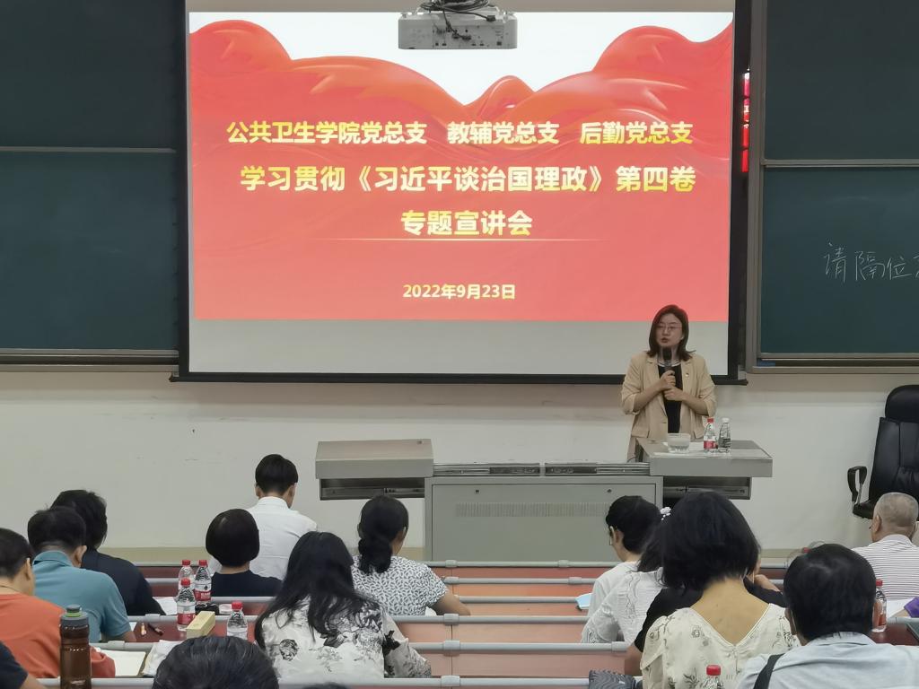 9月23日上午,性吧 党总支联合教辅党总支、后勤党总支在番禺校区开展学习贯彻《习近平谈治国理政》第四卷专题宣讲会。我校宣讲专家组成员,马克思主义性吧 刘涛教授做辅导报告,性吧 党总支刘宇珊副书记主持并讲话。