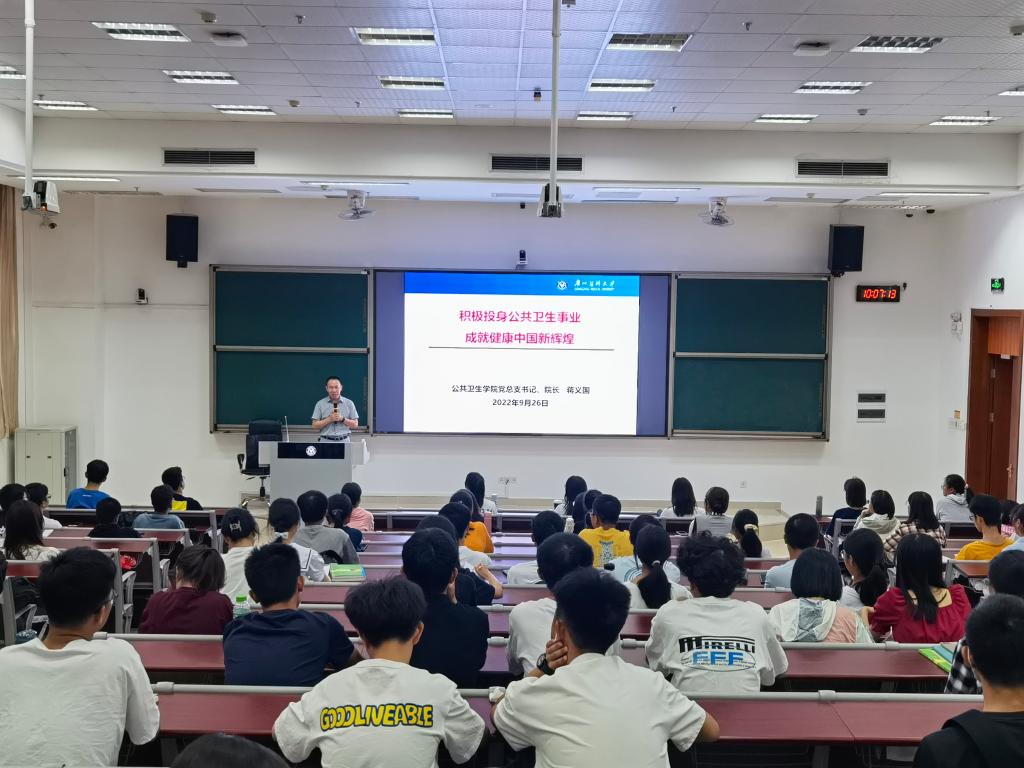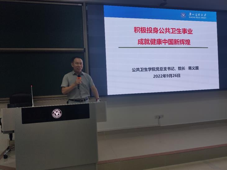 2022年9月26日上午,在番禺校区A3-105教室,性吧 党总支书记、院长蒋义国教授以“积极投身公共卫生事业,成就健康中国新辉煌”为主题给2022级预防医学本科新生讲授了一堂紧密结合专业、生动翔实的新学年思政第一课。