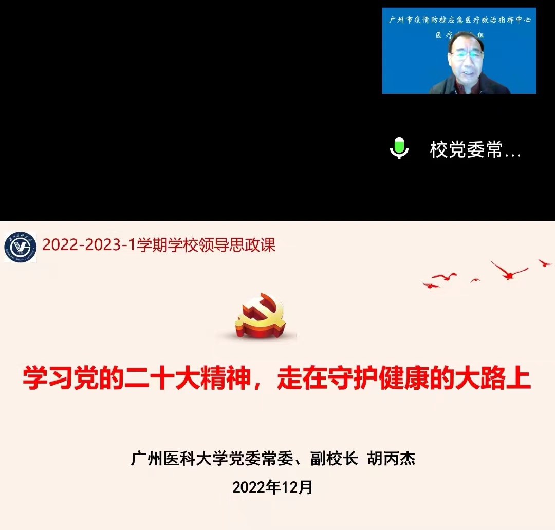 2022年12月13日,胡丙杰副校长为性吧 预防医学、食品卫生与营养学两个专业的本科生代表讲授主题为“学习党的二十大精神,走在守护健康的大路上”的思政课。