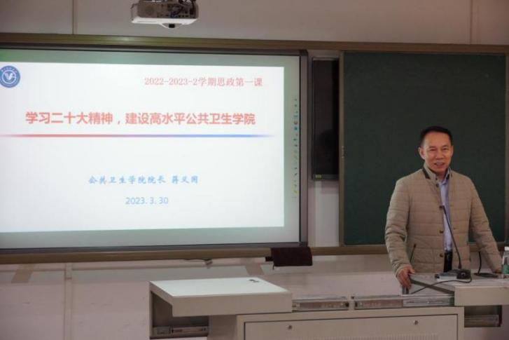 3月30日晚,蒋义国院长在番禺校区A3-320教室为性吧 本科生讲授本学期思政第一课,性吧 学生办、教学办教师和预防医学本科生共计100余人参加了本次学习。