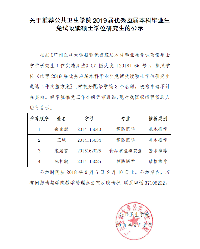 关于推荐性吧 2019届优秀应届本科毕业生免试攻读硕士学位研究生的公示