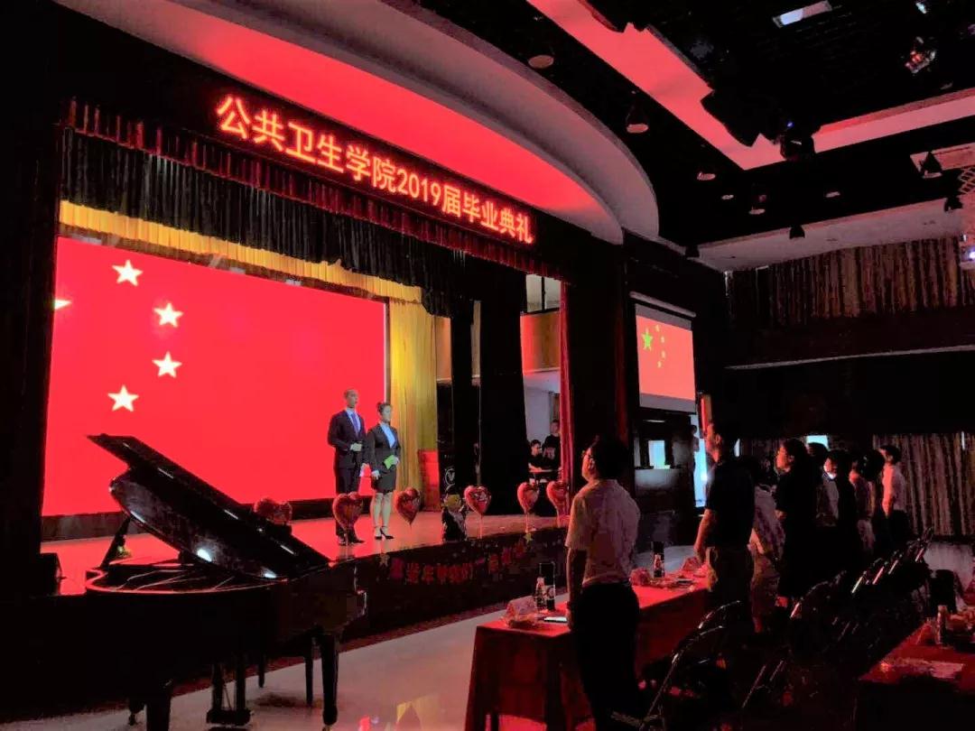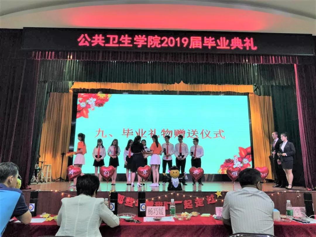伴随着庄严雄壮的国歌声,活动正式拉开序幕。方灿辉副校长和杨巧媛副院长首先为2019年全国大学生公共卫生综合技能大赛的获奖学生以及2019届校级优秀毕业生进行表彰颁奖;毕业生代表李智同学在发言中回顾了5年珍贵的大学时光,并向母校和老师们表达了谢意;随后举行的谢师仪式中,周加欣等4位同学以自创诗歌朗诵的形式向老师们表达了难舍的深情;各专业学生代表黄泽钦、湛晓钧同学则向性吧 赠送锦旗以表敬意。教师代表吴鑫兰老师在发言中鼓励大家将在校期间的所学所知带到以后的学习、工作中去,争取更大的进步;性吧 领导杨巧媛副院长对2019届毕业生取得的成绩和荣誉表示祝贺和感谢,并祝福大家未来一帆风顺;方灿辉副校长则勉励大家牢记“厚德修身、博学致远”的校训,始终关注母校的建设,以饱满的热情投身到将来的发展中去;最后,杨巧媛副院长代表性吧 向同学们赠送毕业礼物,在悠扬动听的校歌合唱中,毕业典礼圆满结束。