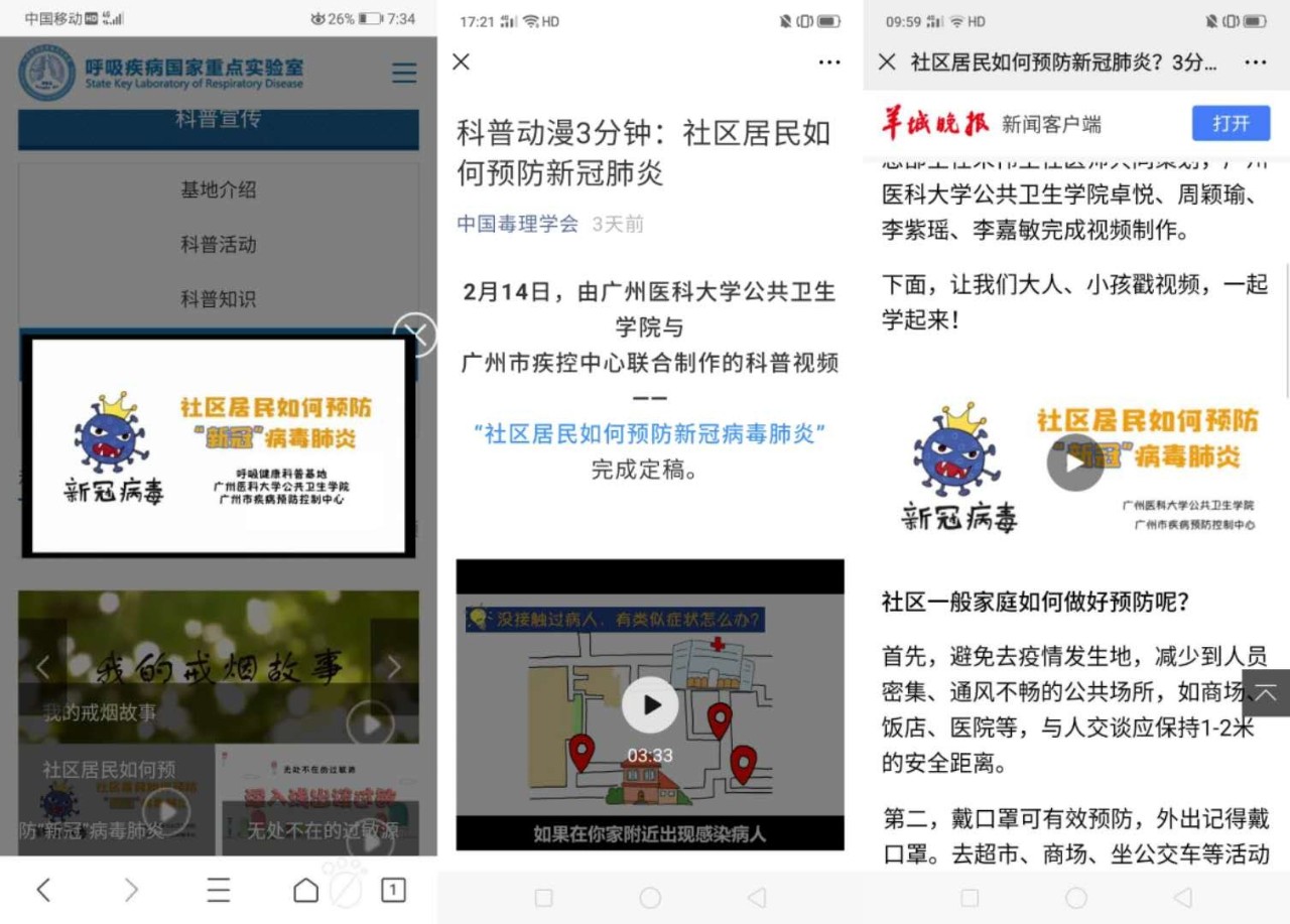 该科普微视频自2月初开始筹划,历时两周,在多位老师指导下,由公卫性吧 2015级预防医学专业本科生卓悦、周颖瑜、李紫瑶、李嘉敏制作完成。本卡通视频形式生动地介绍了新型冠状病毒的传播途径、社区居民预防感染的方法,以及隔离和就医的指引,能帮助大众快速普及相关预防知识,有助于社区疫情防控工作的开展。视频在性吧 、广州市疾病预防控制中心的官微上线后受到广泛好评并迅速传播,广州市部分社区将其作为疫情防控宣传教育的材料。该视频还在中华预防医学会官微、中国毒理学会官微、羊城晚报官微、呼吸疾病国家重点实验室官微、广州市科协等机构的官微和网站平台收录、转载和推广,起到了良好的科普宣教的效果,助力于社区新冠病毒肺炎的防控。
