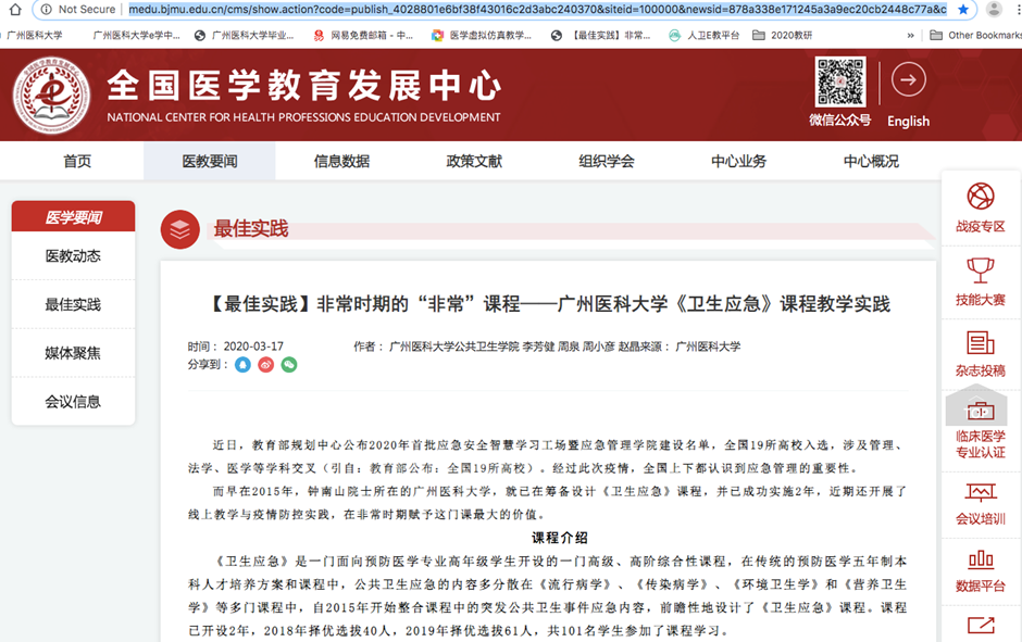 近日,公卫性吧 实践教学经验总结文章“非常时期的‘非常’课程——性吧 《卫生应急》课程教学实践”,在全国医学教育发展中心网站医教要闻的“最佳实践”栏目登载,并在其官微公众号推出,产生了广泛影响。