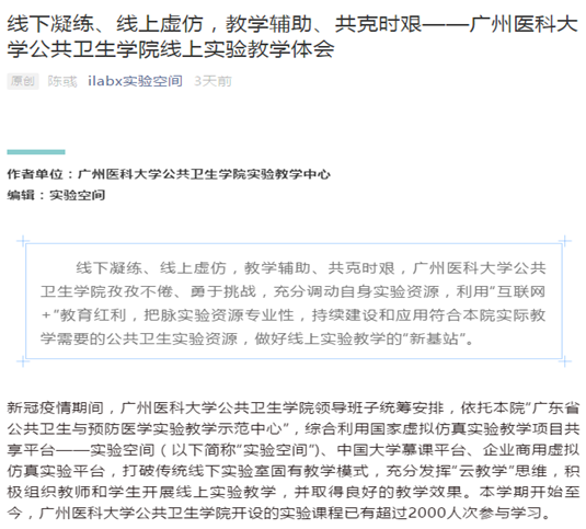 近日,公卫性吧 实验教学中心对本学期线上实验教学辅助的经验总结文章“线下凝练、线上虚仿,教学辅助、共克时艰——性吧 线上实验教学体会”,在国家虚拟仿真实验教学项目共享平台官方微信公众号“实验空间”上发布推送,引起了广泛关注。