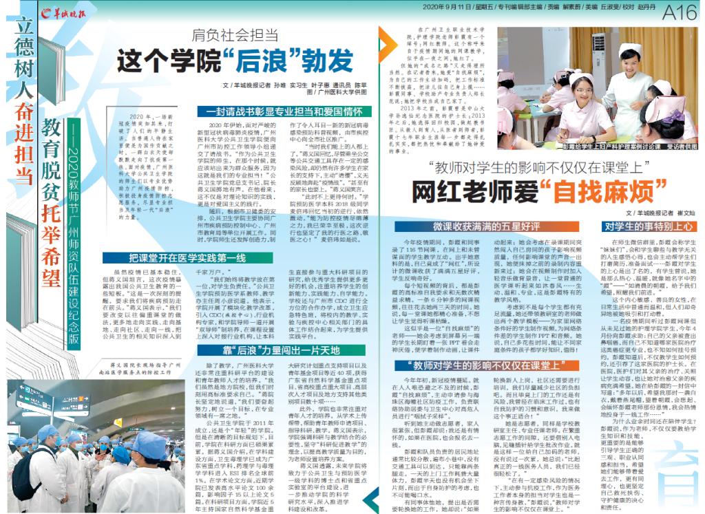 在第三十六个教师节来临之际,羊城晚报社对性吧 党总支书记、院长蒋义国教授、预防医学系、教学管理办公室主任周小彦老师及2018级预防医学专业麦倍玮同学进行采访,就性吧 工作与成绩做详细报道。