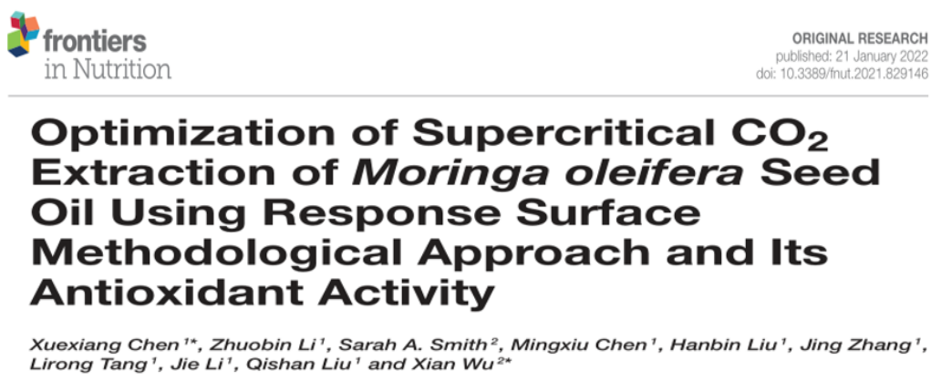 在Frontiers in Nutrition上发表的论文,题为Optimization of supercriticalCO2extraction of moringa oleifera seed oil using response surface methodological approach and its antioxidant activity。该研究探索和明确了新资源食品辣木籽油的超临界CO2萃取最佳工艺、辣木籽油脂肪酸组成及抗氧化活性,研究结果揭示了辣木籽油在食品和保健行业的潜在价值,为辣木籽油在功能性食品、保健品和化妆品中的开发应用提供了科学依据。