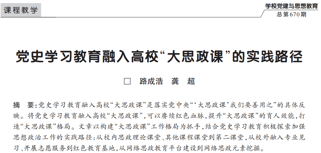 路成浩老师今年还在《学校党建与思想教育》期刊上以第一作者发表了研究论文“党史学习教育融入高校‘大思政课’的实践路径”。《学校党建与思想教育》是中文社会科学引文索引(CSSCI)来源期刊,是全国教育系统唯一党建期刊。该论文还获得广东省学校党建研究会本科分会年度论文二等奖。
