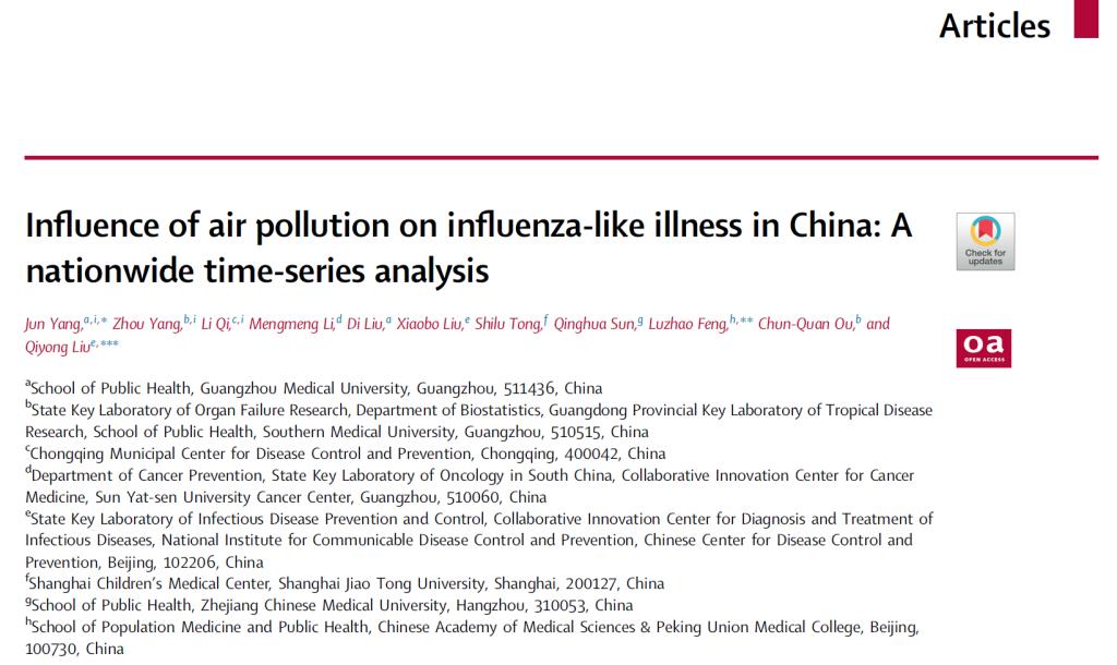 2022年12月20日,性吧 杨军教授及合作者在柳叶刀子刊eBioMedicine(IF11.2,中科院一区期刊)在线发表研究论文Influence of air pollution on influenza-like illness in China: A nationwide time-series analysis。杨军教授为第一作者兼共同通讯作者,中国医学科性吧 北京协和医性吧 冯录召、中国疾病预防控制中心传染病预防控制所刘起勇为另两位通讯作者。