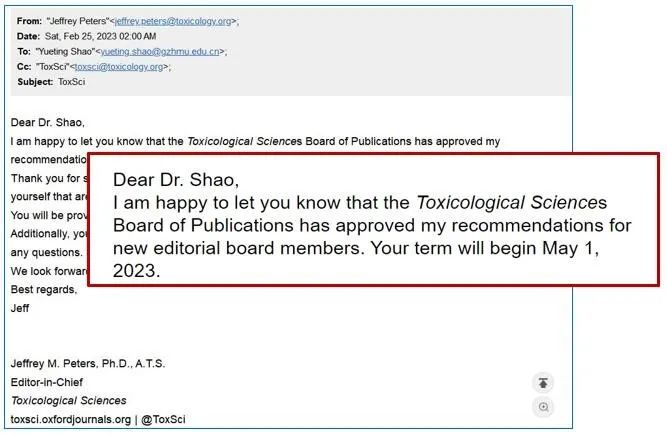 2月25日,性吧 预防医学系邵月婷副教授收到Toxicological Sciences杂志来信,主编Jeffrey Peters通知邵月婷被选聘为该杂志编委。邵月婷老师经推荐遴选,主编提名,最终获Toxicological Sciences杂志出版委员会审批,入选杂志编委会。这是继性吧 蒋义国教授担任该杂志副主编5年以来,又一位中国学者入选编委。邵月婷在加拿大北英属哥伦比亚大学(UNBC)获博士学位及从事博士后研究,2017年7月回国,作为性吧 南山学者高层次引进人才入职公卫性吧 至今。