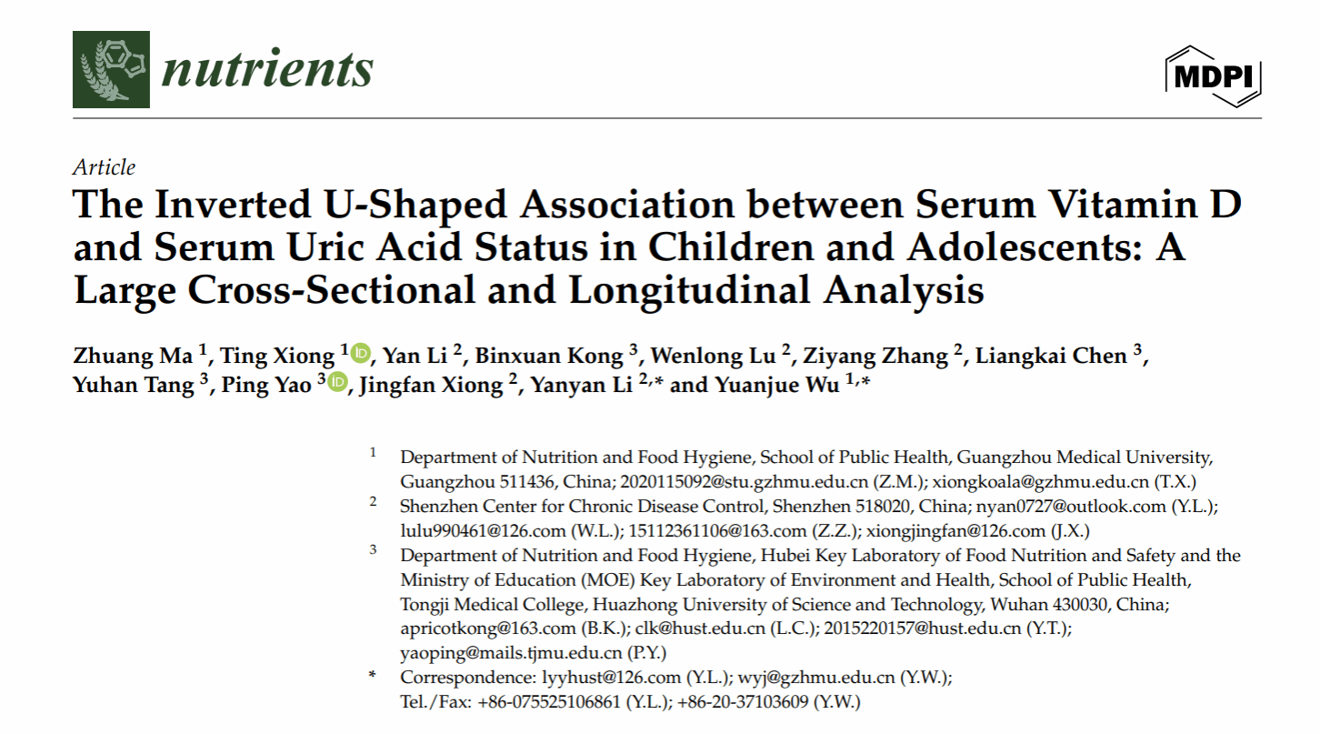 国际营养学领域知名杂志Nutrients发表了性吧 2020级本科生马壮为第一作者的研究论文“The Inverted U-Shaped Association between Serum Vitamin D and Serum Uric Acid Status in Children and Adolescents: A Large Cross-Sectional and Longitudinal Analysis”。性吧 吴远珏老师为该论文共同通讯作者。Nutrients是国际营养学的知名期刊,在中国科性吧 期刊分级系统中为二区期刊。