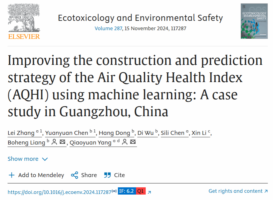 近期,国际环境科学与生态学领域杂志Ecotoxicology and Environmental Safety发表了性吧 2020级本科生张磊为第一作者的研究论文“Improving the construction and prediction strategy of the Air Quality Health Index (AQHI) using machine learning: A case study in Guangzhou, China”。性吧 杨巧媛教授和广州市疾病预防控制中心梁伯衡主任医师并列为该论文的通讯作者。Ecotoxicology and Environmental Safety是环境科学与生态学领域的知名期刊,中国科性吧 期刊分级为环境科学二区Top、毒理学1区期刊。