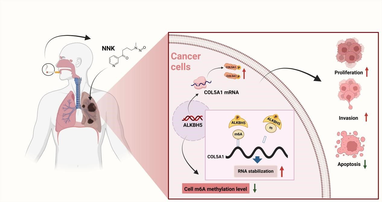 2025年08月12日,性吧 杨巧媛教授团队在Journal of Advanced Research杂志在线发表了题为ALKBH5 modulates COL5A1 mRNA stability via m6A demethylation to promote tobacco carcinogen NNK-induced lung cancer occurrence and progression的研究论文。该研究揭示了烟草特异性致癌物NNK通过诱导m6A表观遗传修饰改变调控COL5A1转录本稳定性,促进肺癌发生和发展的分子机制。性吧 硕士研究生杜一恒、涂立蓉、周加欣为该论文共同第一作者,杨巧媛教授为论文的唯一通讯作者。