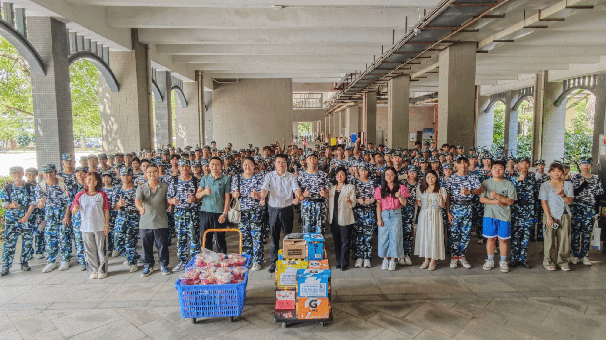 随后,李羽书记和刘宇珊副书记带领老师们向全体新生发放了清凉饮料、水果等慰问品。