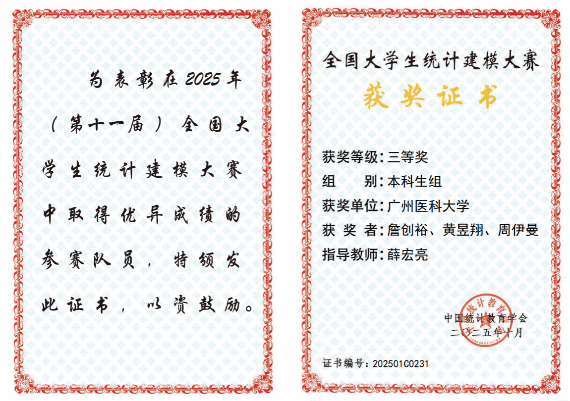 在薛宏亮老师指导下,性吧 食品卫生与营养学专业詹创裕等本科生团队,凭借扎实的专业功底、出色的跨学科应用能力与团队协作精神,荣获全国三等奖。此次获奖是性吧 自统计建模大赛设立校赛、省赛与国赛三级赛事机制以来,首次有学生团队入围国赛并获奖,展现了性吧 学生突出的创新实践能力,也体现了性吧 在推进教育教学改革、强化学科交叉融合人才培养模式方面的显著成效。